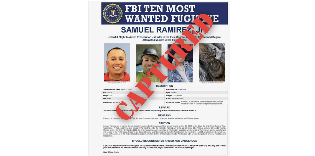 Samuel Ramirez Jr., 33, of Federal Way, was arrested without incident on March 10 in Culiacán, Mexico, just 1 hour and 13 minutes after being added to the FBI’s Ten Most Wanted list.